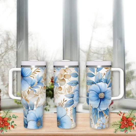 Blue with Gold Trim Christmas Flowers | 40 oz Tumbler