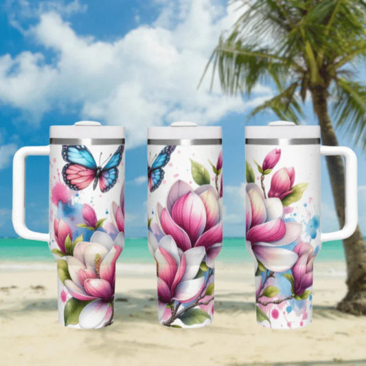 Magnolia Flowers with Blue & Pink Butterfly 40 oz Tumbler