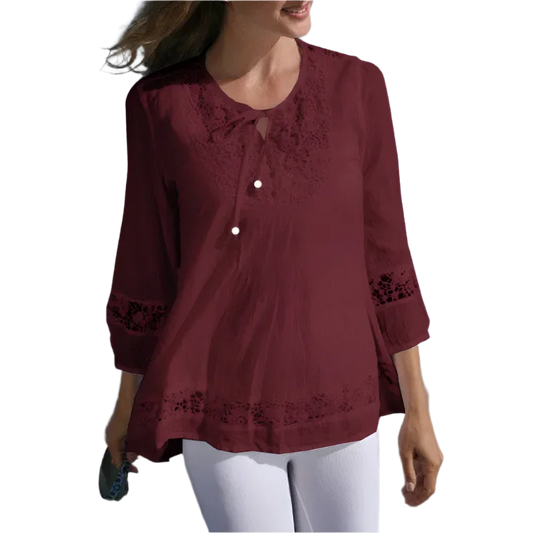 Cotton Linen Lace Splice Top – Women’s 3/4 Sleeve Casual Tunic