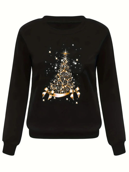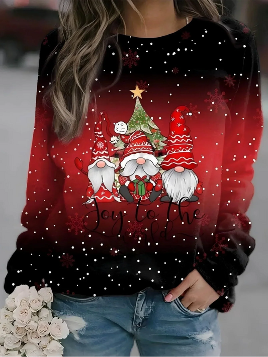 Christmas Printed Loose Knit Sweater Top Long Sleeve Winter Black Casual