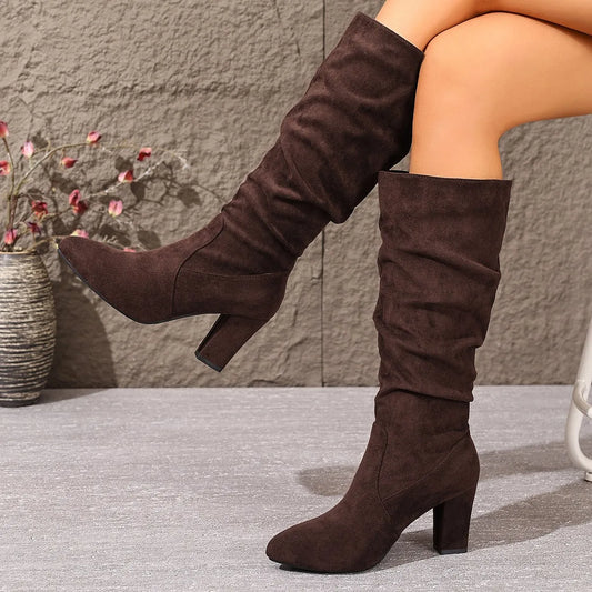 Faux Suede Pointed Toe Knee-High Boots With Square Heels