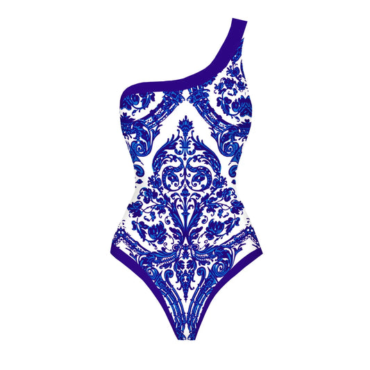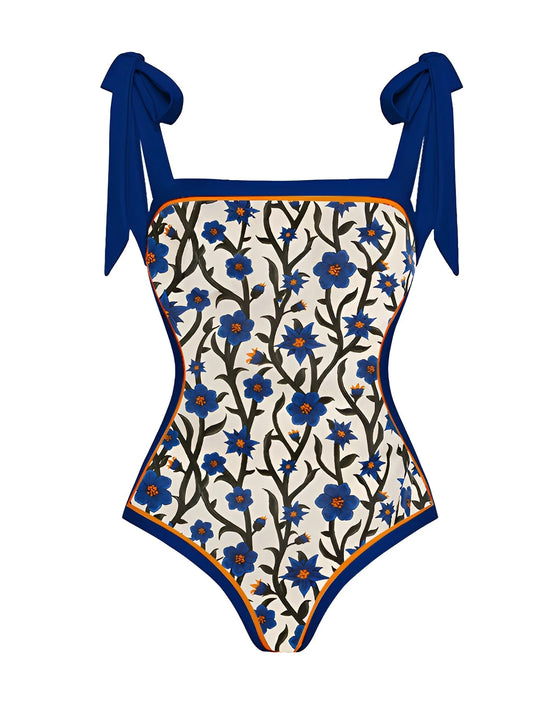 One-Piece Blue Flower Vine Swimsuit & Sarong Beachwear Set
