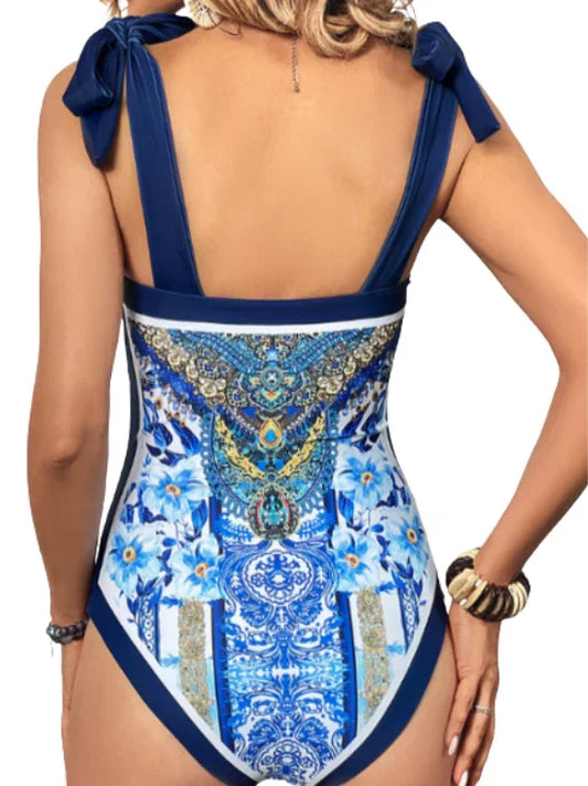 Vintage Baroque Print V-Neck One-Piece Swimsuit – Chain Detail Monokini