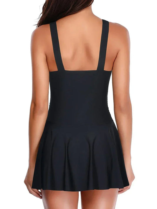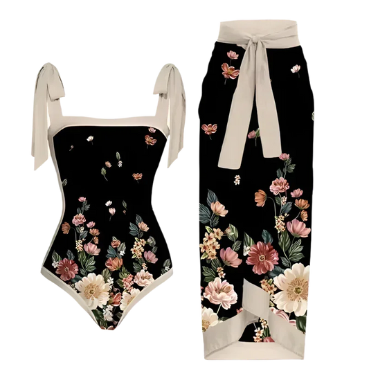 Black & Floral Elegant One-Piece Swimsuit with Skirt – Bowknot Brazilian Style