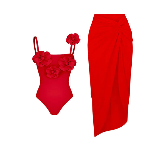 Red & Blue Mosaic Print One-Piece Swimsuit With Skirt & Sarong