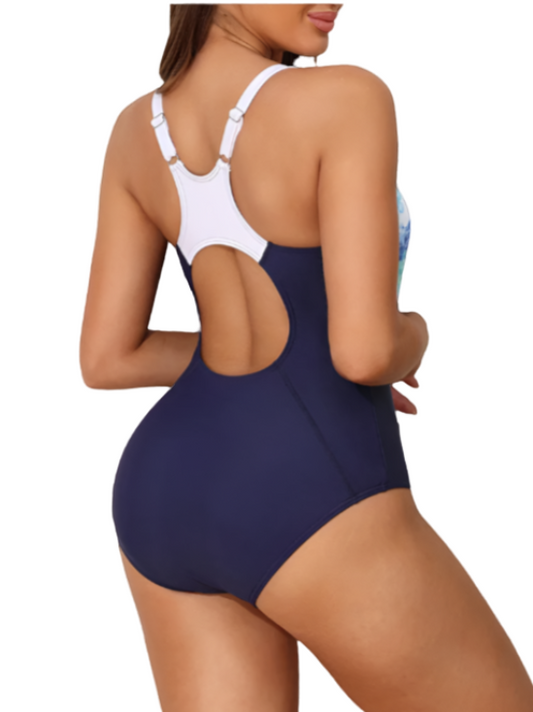 Navy & Print One-Piece Swimsuit – Patchwork Racerback