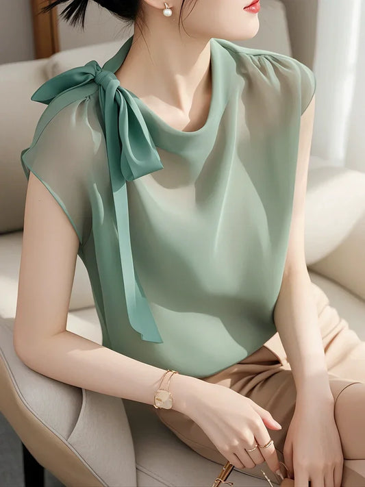 Green Chiffon Bow Blouse Slim Fit Summer Top For Warm Weather