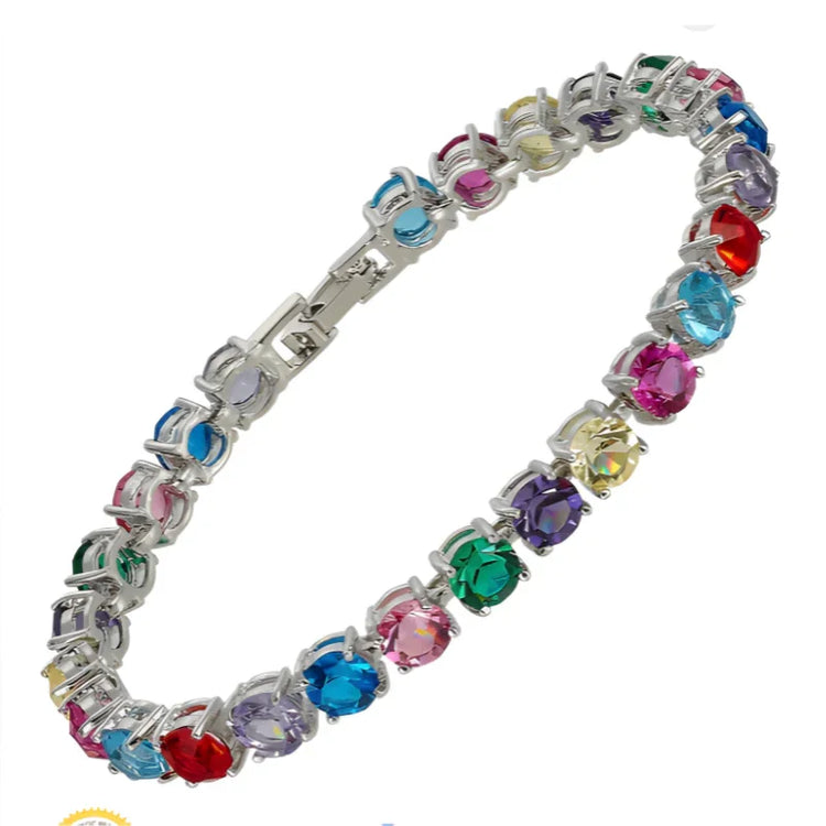 This glittering rainbow crystal bracelet elevates festive and everyday outfits with a touch of refined sparkle. Wear it to holiday gatherings, weddings, or dinners to add a pop of color to a sleek dress, blouse, or knit sweater. The faceted round CZ stones catch the light from every angle, creating a vivid rainbow shimmer as you move.