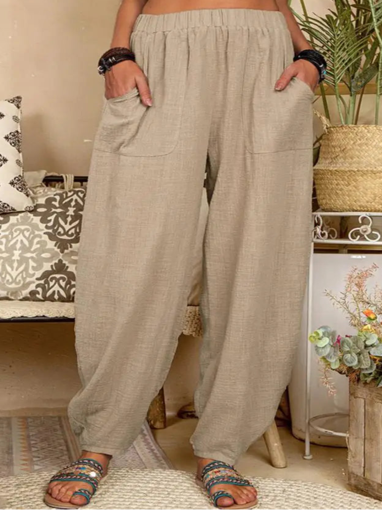 Fabric and stretch: Crafted from a soft cotton-linen blend with slight stretch and a flat-front waistband, these pants deliver breathable comfort and everyday wearability in hot weather. The lightweight weave keeps you cool, while the relaxed cut drapes naturally for a flattering, easygoing vibe.